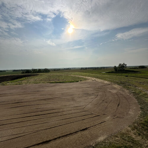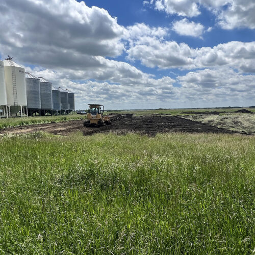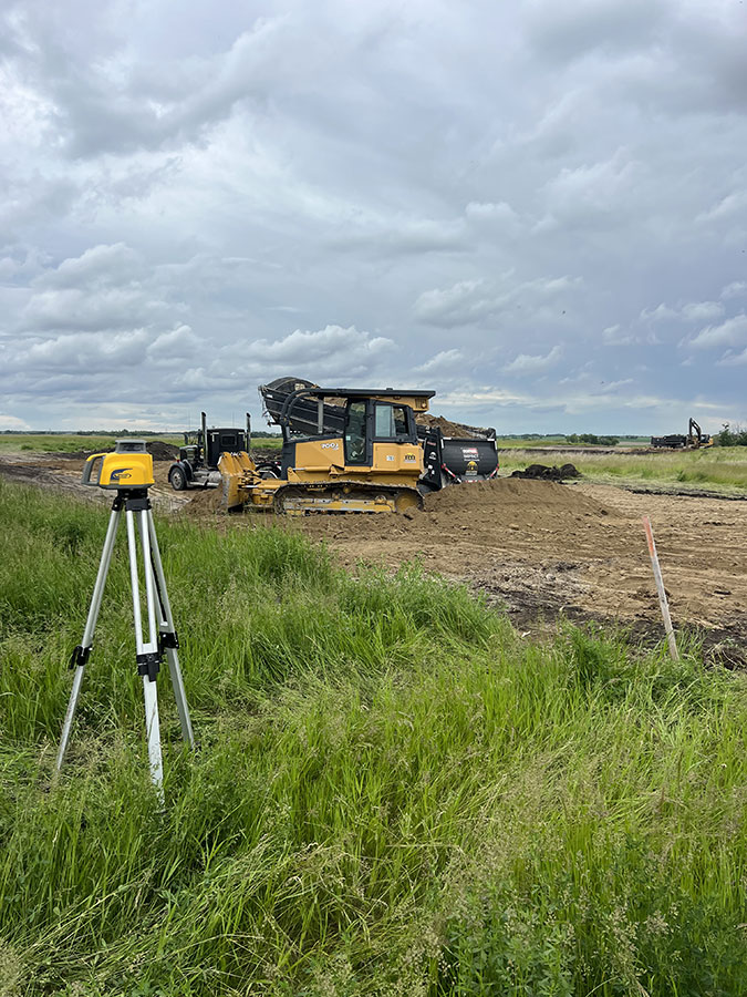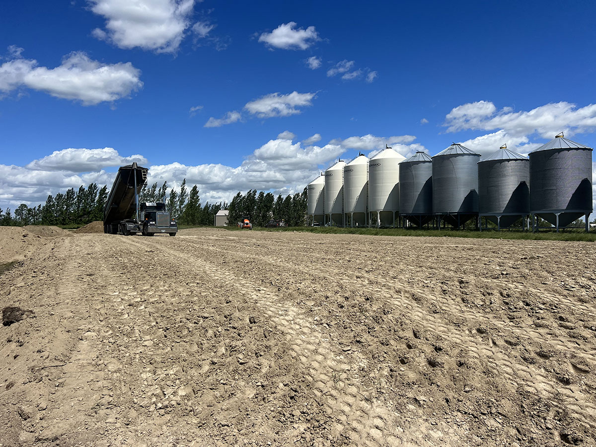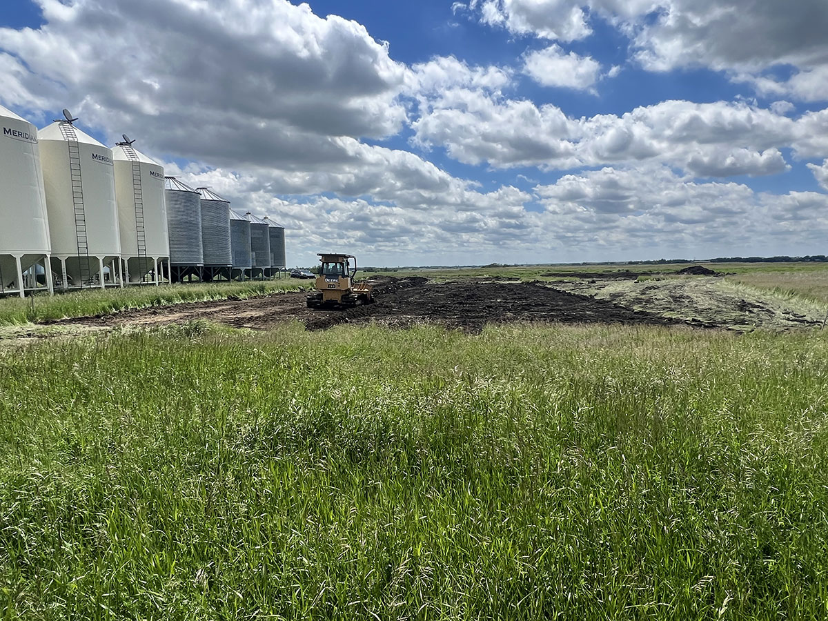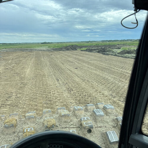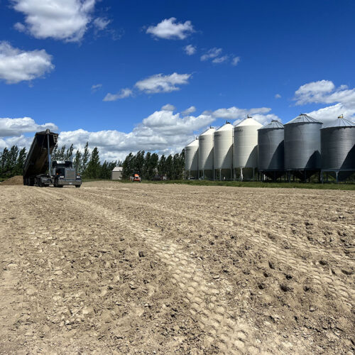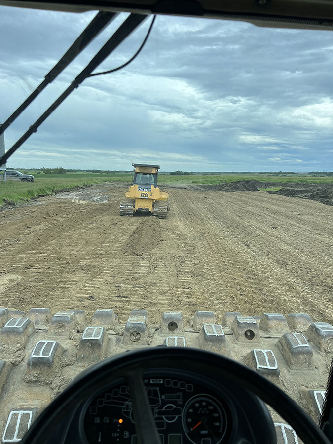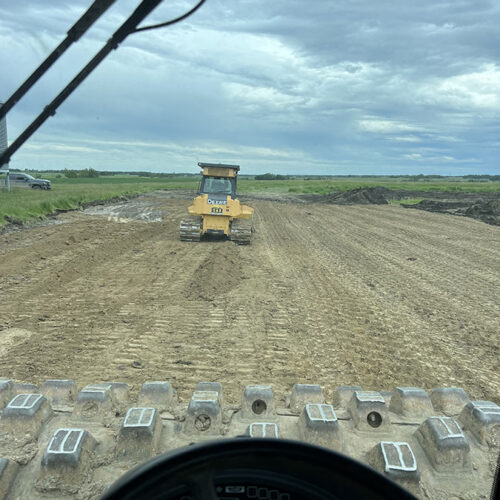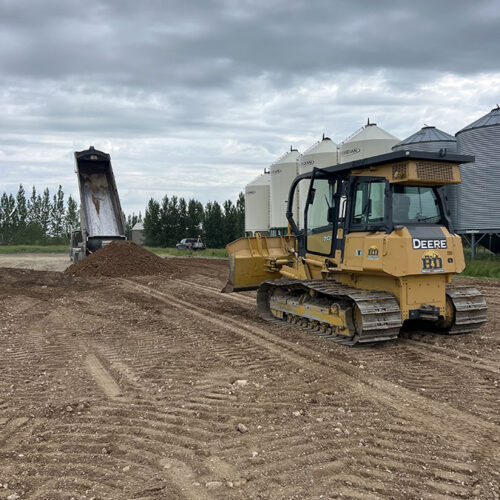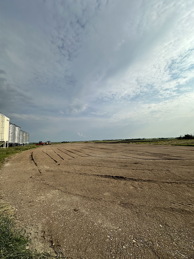 Farm storage shed pad. With this project we had to strip topsoil away, and make a clay cut through a hill to allow the area to drain properly. We then hauled the clay in and compacted it in lifts. We then installed our laser receiver on the dozer and brought the pad up level. We finished it off with a 6” layer of gravel.