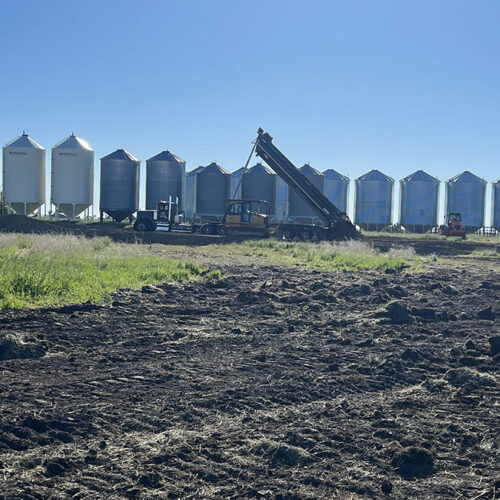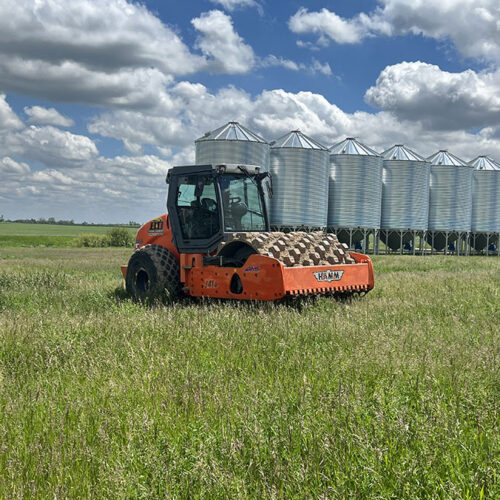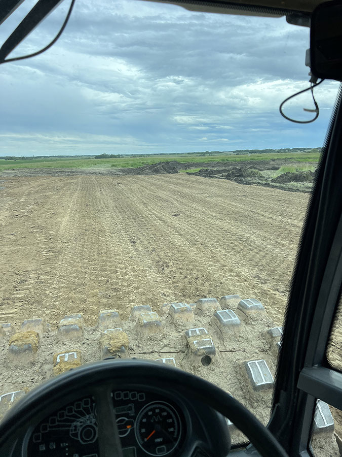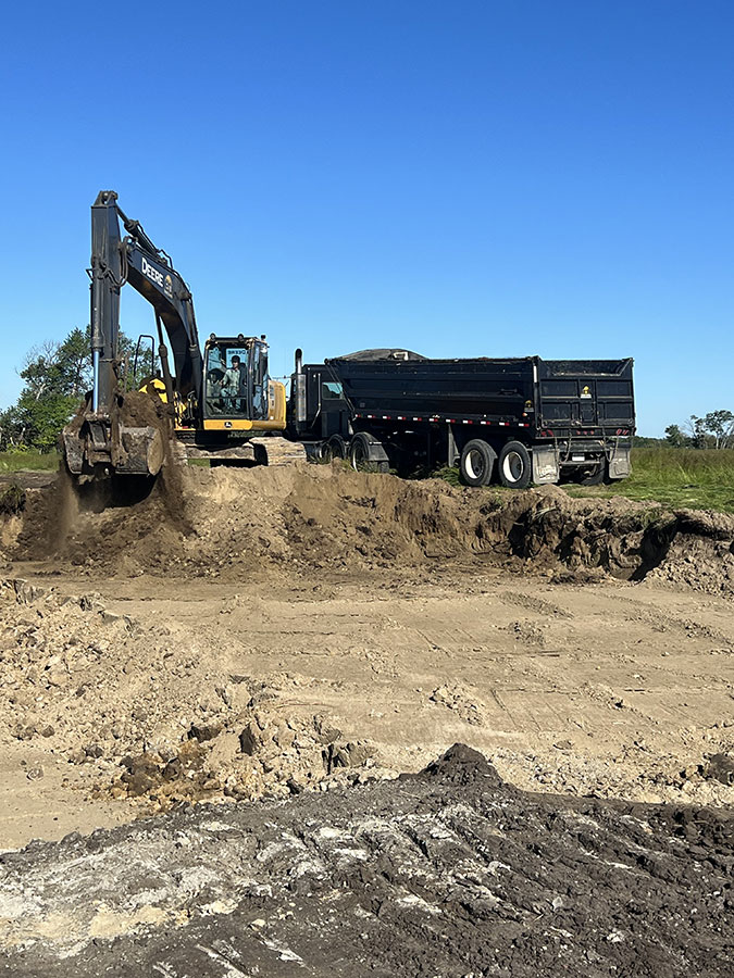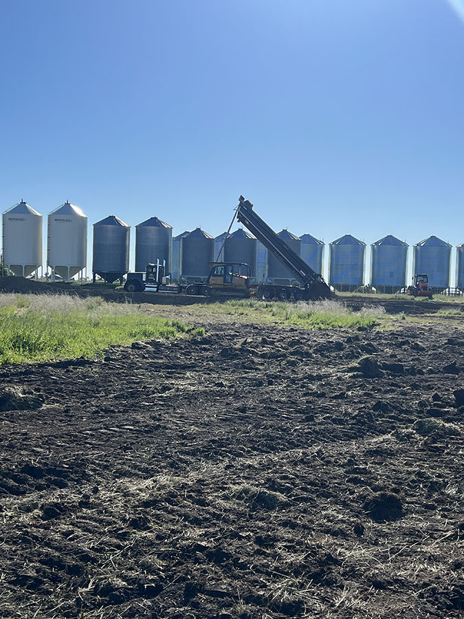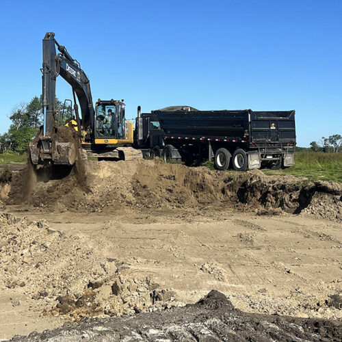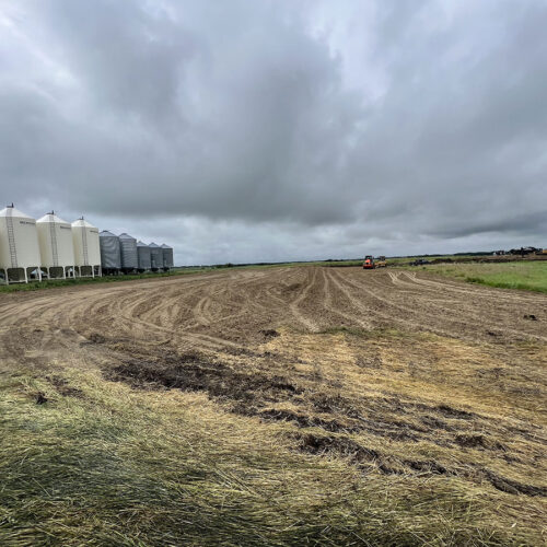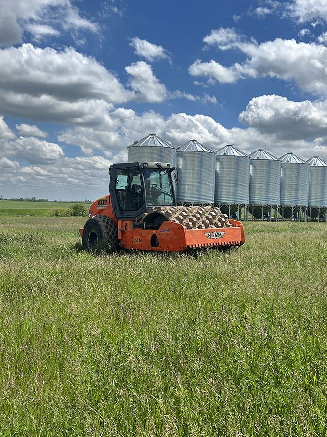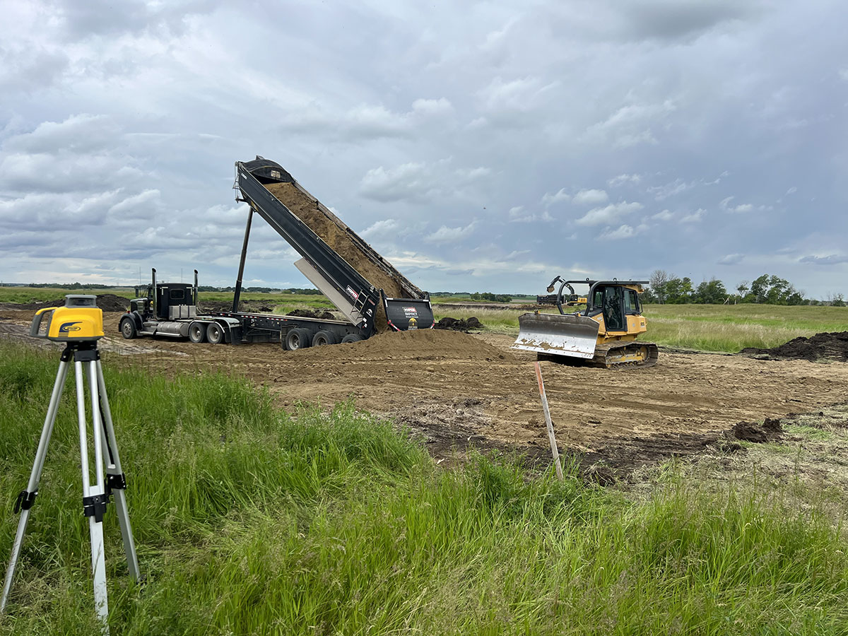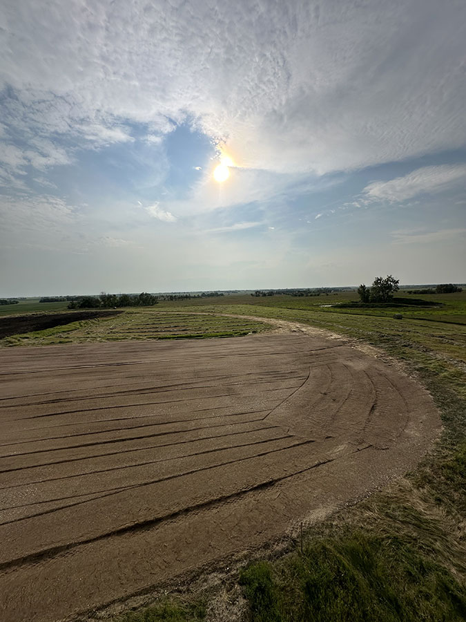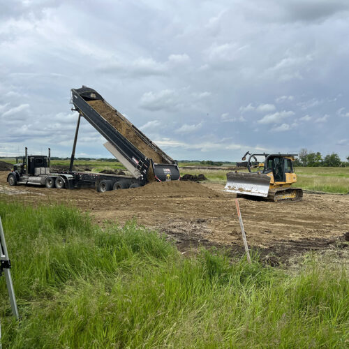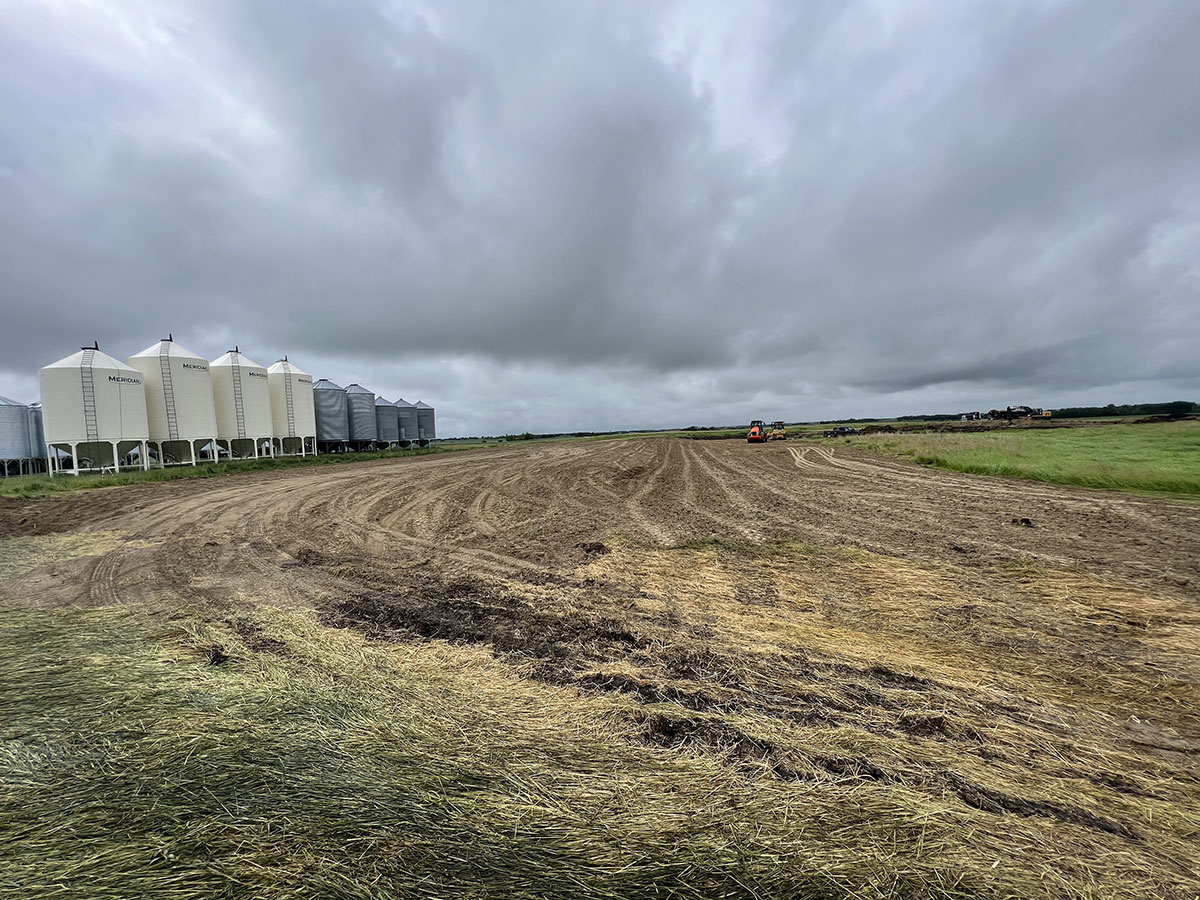 Farm storage shed pad. With this project we had to strip topsoil away, and make a clay cut through a hill to allow the area to drain properly. We then hauled the clay in and compacted it in lifts. We then installed our laser receiver on the dozer and brought the pad up level. We finished it off with a 6” layer of gravel.