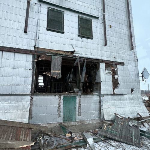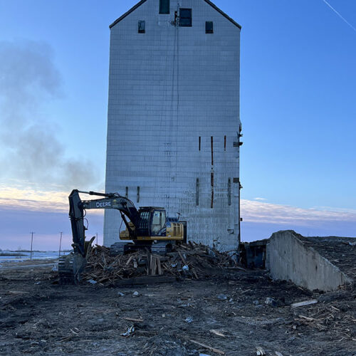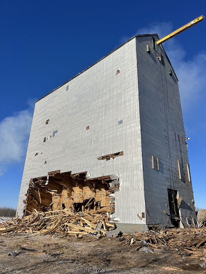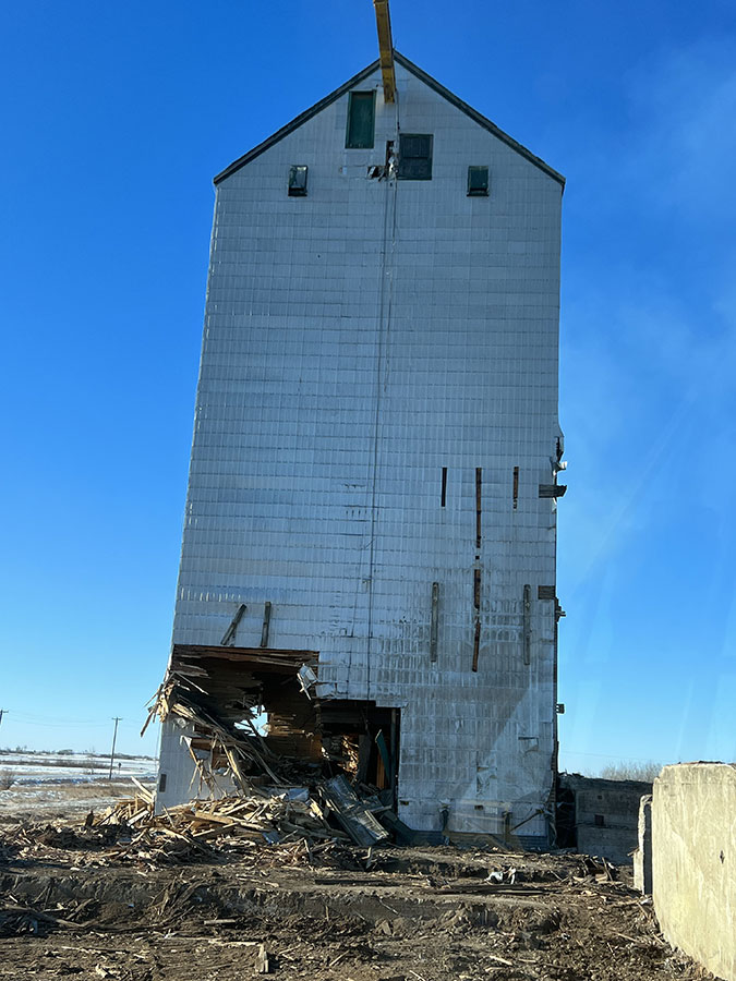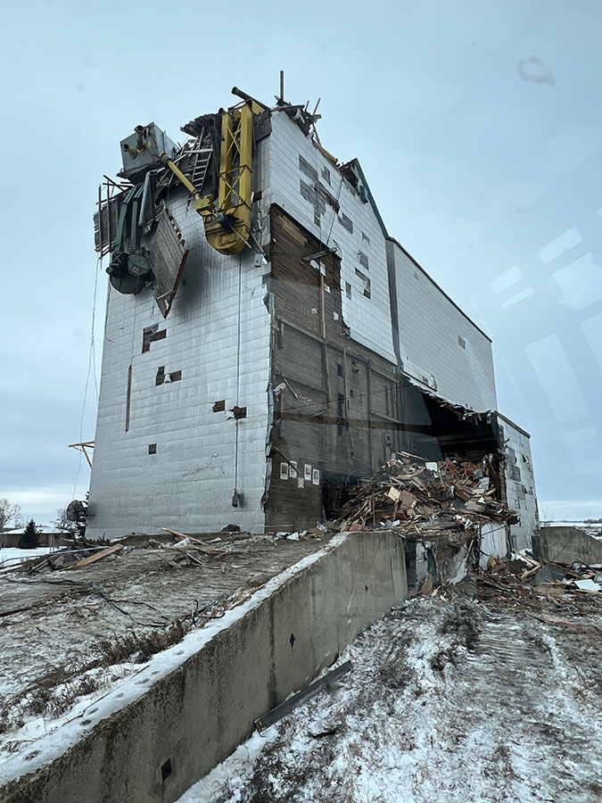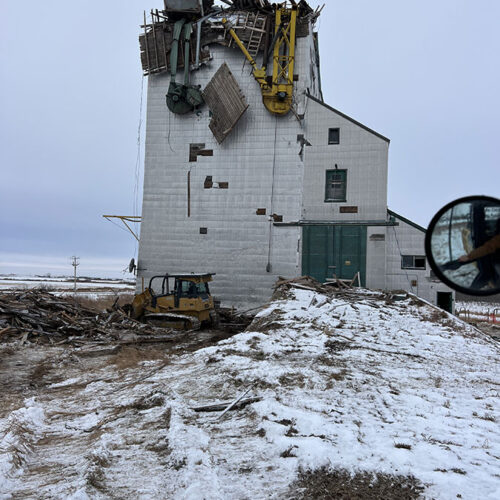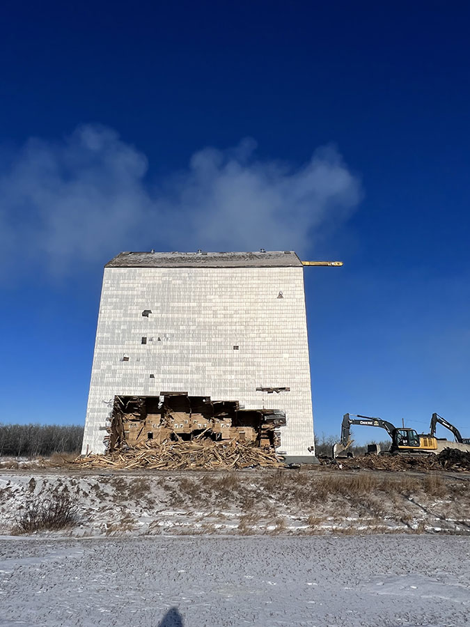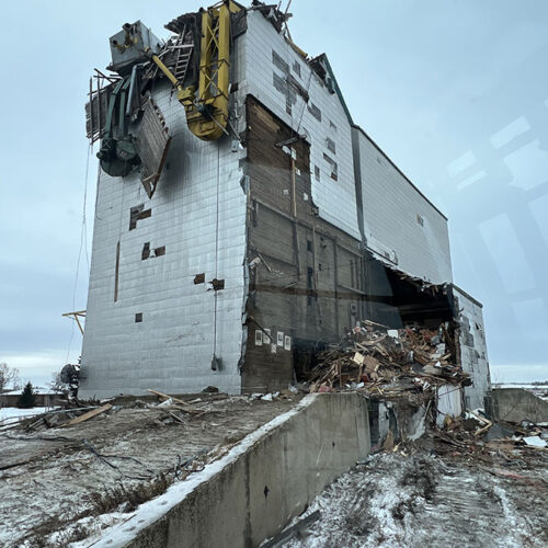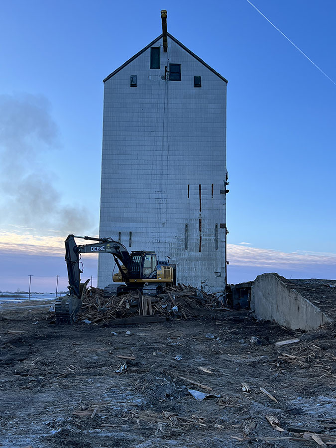 Sinclair elevator demo. After a summer storm destroyed the top of this elevator we got asked to demolish it for an insurance claim. We started by taking off the office area and put area. Followed by the main structure and then the annex. We burnt the wood on site, separated the scrap metal and used a concrete hammer to break up the concrete. We then put the concrete in the burn pit, and clay capped it along with landscaping the area where the elevator was.