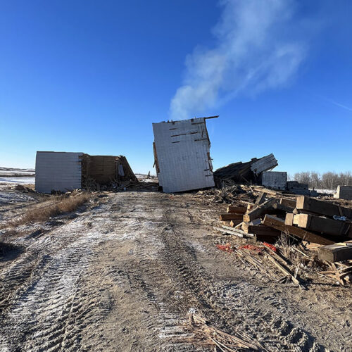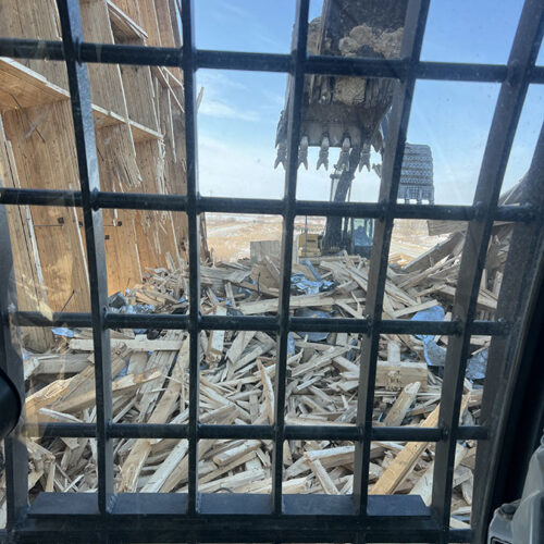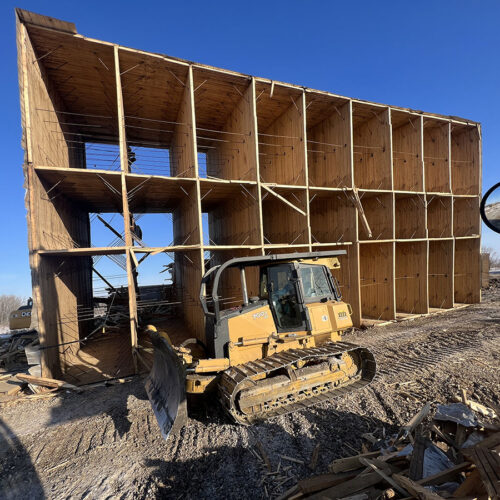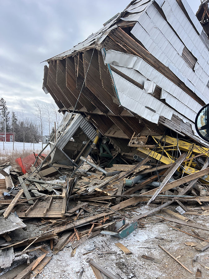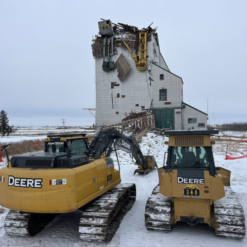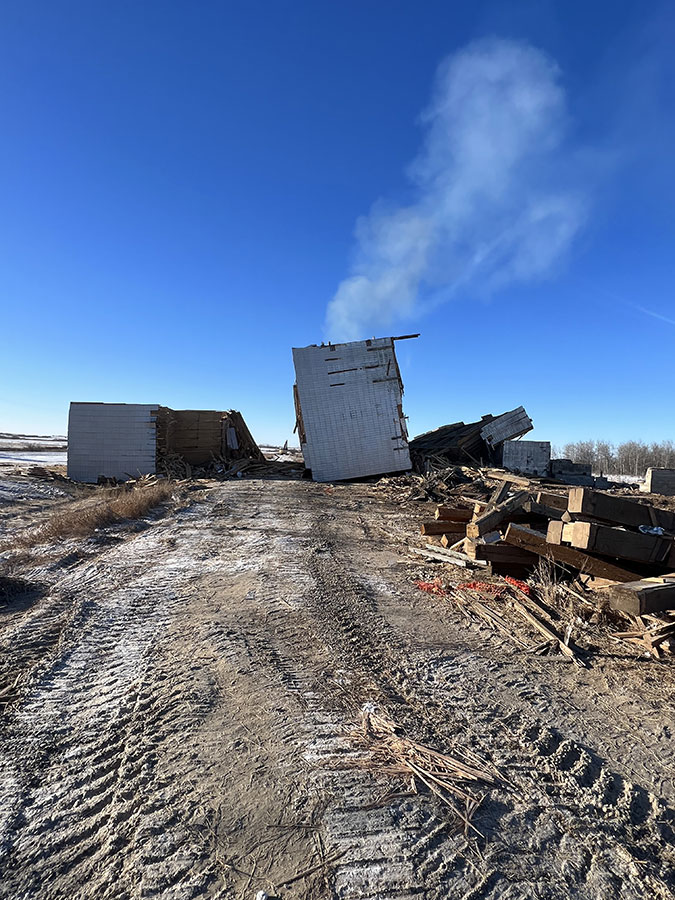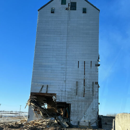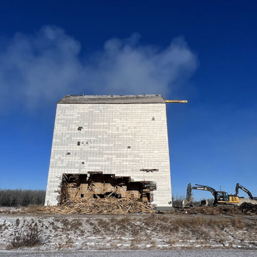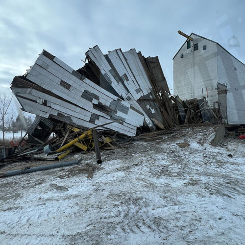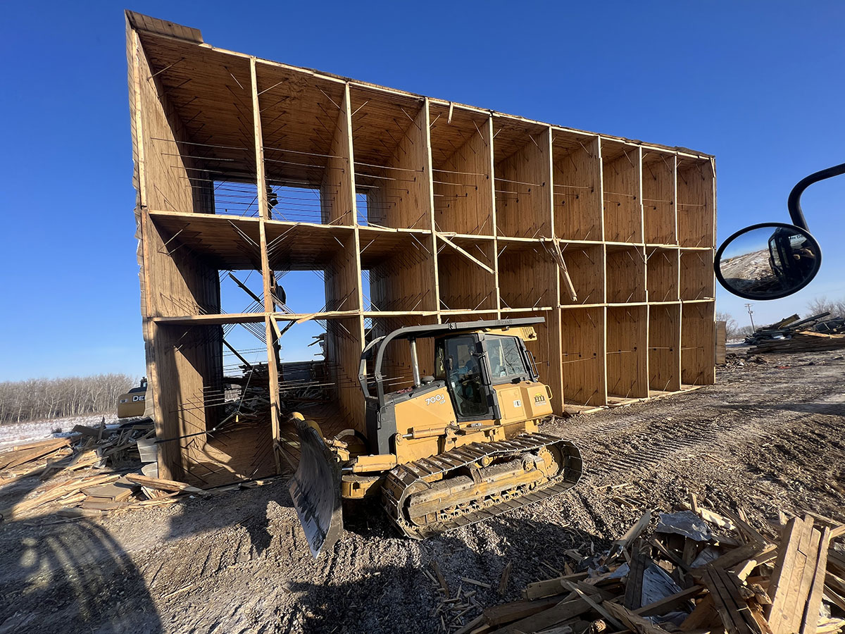 Sinclair elevator demo. After a summer storm destroyed the top of this elevator we got asked to demolish it for an insurance claim. We started by taking off the office area and put area. Followed by the main structure and then the annex. We burnt the wood on site, separated the scrap metal and used a concrete hammer to break up the concrete. We then put the concrete in the burn pit, and clay capped it along with landscaping the area where the elevator was.